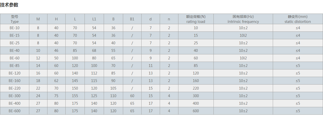 BE型橡膠避震器由金屬與橡膠復合制成,金屬表面全部包復橡膠,能防止金屬銹蝕。產品固有頻率低,阻尼比適宜,橫向剛度高于垂向剛度,適用平置、倒置及側掛等多種安裝形式。